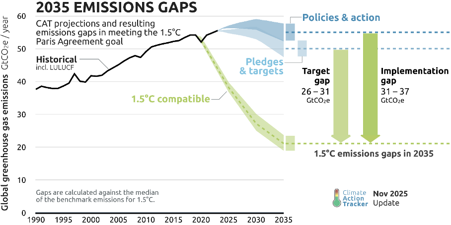 Der bei der COP30 vorgelegte NDC Synthesis Report zeigt deutlich: Die aktuellen Anstrengungen sind zu wenig ambitioniert, um das Ziel des Pariser Übereinkommens zu erreichen, die globale Erderwärmung deutlich unter 2 °C und auf 1,5 °C gegenüber dem vorindustriellen Niveau zu begrenzen. Jedoch zeigt das Pariser Übereinkommen eine klare Wirkung, da die Projektion der Erderwärmung innerhalb von 10 Jahren von 3,6 °C auf 2,6 °C gesenkt werden konnte, wenn alle nationalen Klimapläne erfüllt würden. Gleichzeitig ergab eine Analyse des Climate Action Trackers, dass die globalen Emissionen weiter ansteigen und es weiterhin eine große Emissionslücke zwischen dem Ziel- und dem Ist-Zustand gibt (siehe Abbildung). Kohle- und Ölverbrauch nehmen zu; der Höchststand der Emissionen ist noch nicht erreicht. Noch klarer zeigt eine Analyse des restlichen Kohlenstoffbudgets: Unser Restpensum, um das 1,5-°C-Ziel zu erreichen, ist praktisch aufgebraucht.