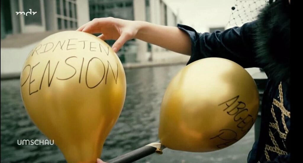 Zum Abschluss ließen die Beteiligten goldene Luftballons mit der Aufschrift „Abgeordnetenpension“ zerplatzen – eine einfache, aber einprägsame Geste, die zeigen sollte, dass die Abschaffung des Pensionsprivilegs der Abgeordneten keinen Aufschub mehr duldet. Die Zeit dafür ist jetzt, in der laufenden Legislaturperiode! Ab der nächsten Wahlperiode sollten dann neue Regeln der Altersversorgung gelten.