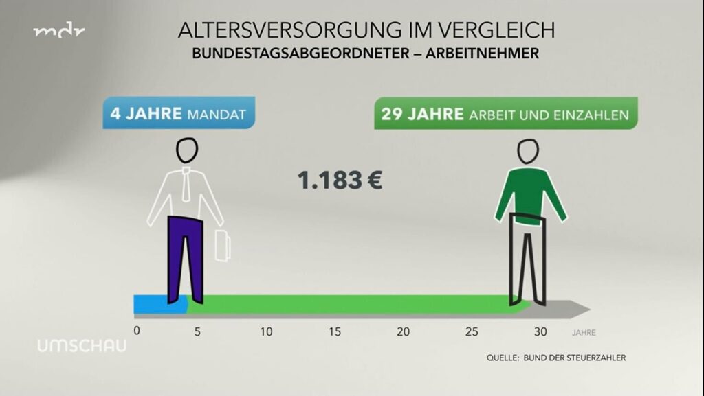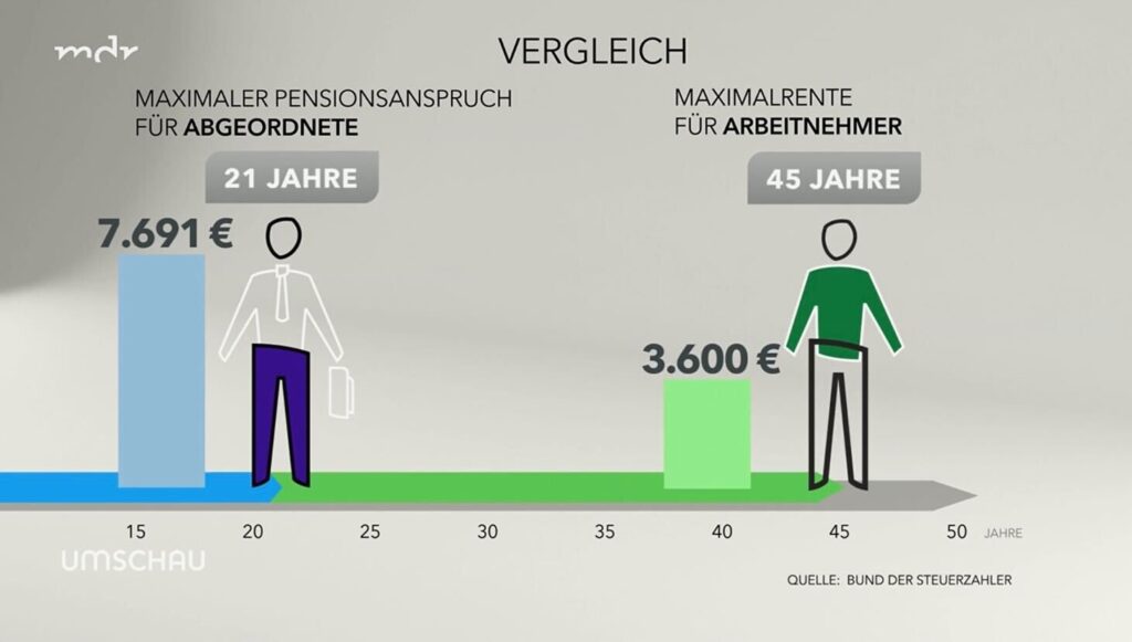 Noch deutlicher wird die Diskrepanz, wenn man sich den Maximalanspruch für einen Abgeordneten anschaut. Der liegt derzeit bei knapp 7.700 € und wird schon nach 21 Jahren, also nach einem halben Arbeitsleben, erreicht. Dagegen liegt die Höchstrente derzeit bei knapp 3.600 €, dafür muss ein Arbeitnehmer aber 45 Jahre lang stets bis zur Betragsbemessungsgrenze in die Rentenversicherung einzahlen, also mehr als 8.000 € im Monat verdienen.