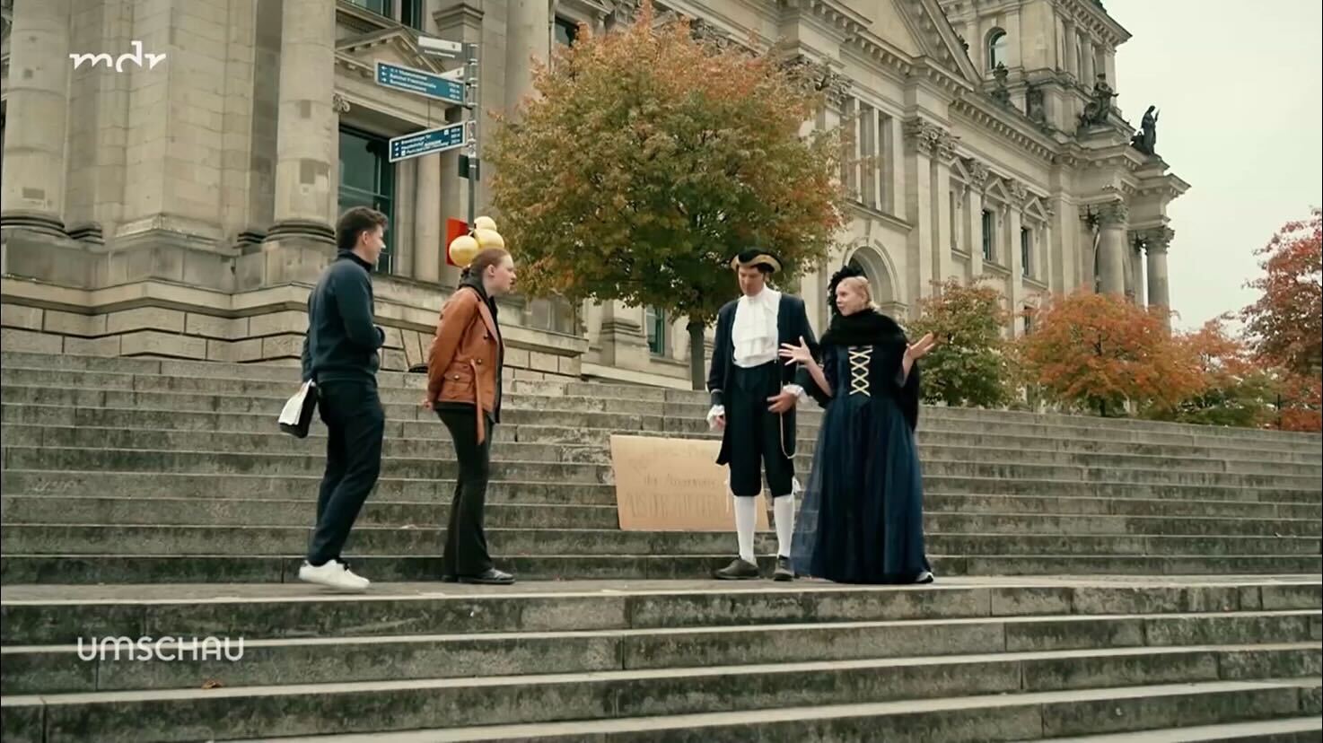 Anstelle einer klassischen Kundgebung wählte die SRzG eine ungewöhnliche Form des Protests: eine öffentliche Theaterperformance. Dabei schlüpften zwei Beteiligte in historische Kostüme und spielten Adelige, während zwei als gewöhnliche Bürger auftraten. Das Theaterspiel stellte die krasse Besonderheit der Abgeordnetenpensionen dar, auch im internationalen Vergleich, und verglich sie mit den Privilegien des Adels früherer Zeiten. Ironie sollte helfen, die Absurdität des Pensionsprivilegs unserer Mitglieder des Bundestags sichtbar zu machen. Hier geht’s zur Vollversion des Drehbuchs. Ein Auszug ist ebenfalls verfügbar:
